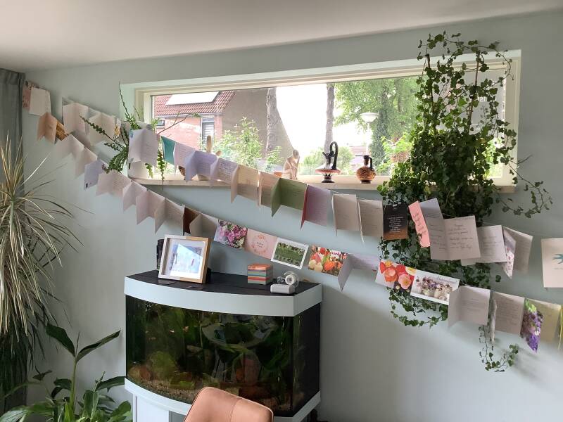 En dan heb ik nog niet eens over alle kaarten die ik heb ontvangen en nog dagelijks ontvang. Ik voel mij zo gedragen door al dit medeleven. We hebben een draad gespannen van de voorkant naar de achterkant van het huis. Die draad hangt helemaal vol. We hebben vervolgens maar een tweede draad gespannen onder de eerste lijn. En ook die hangt al helemaal vol. Ongelofelijk. Dank je wel. Dank je wel.